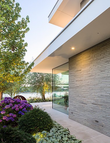 Mehr lesenAngesichts dieser exponierten Lage ist es verständlich, dass sich die Bauherren ein transparentes Gebäude mit viel Glas und zahlreichen Durchblicken wünschten. Das Wohnhaus besteht aus einem Voll- und einem Staffelgeschoss mit rundum ausladenden Deckenscheiben, die im Obergeschoss einen Rundlauf um das Haus ermöglichen. Die weiten Auskragungen bieten zudem einen konstruktiven Sonnenschutz, der das Sonnenlicht in den Sommermonaten abschirmt.
