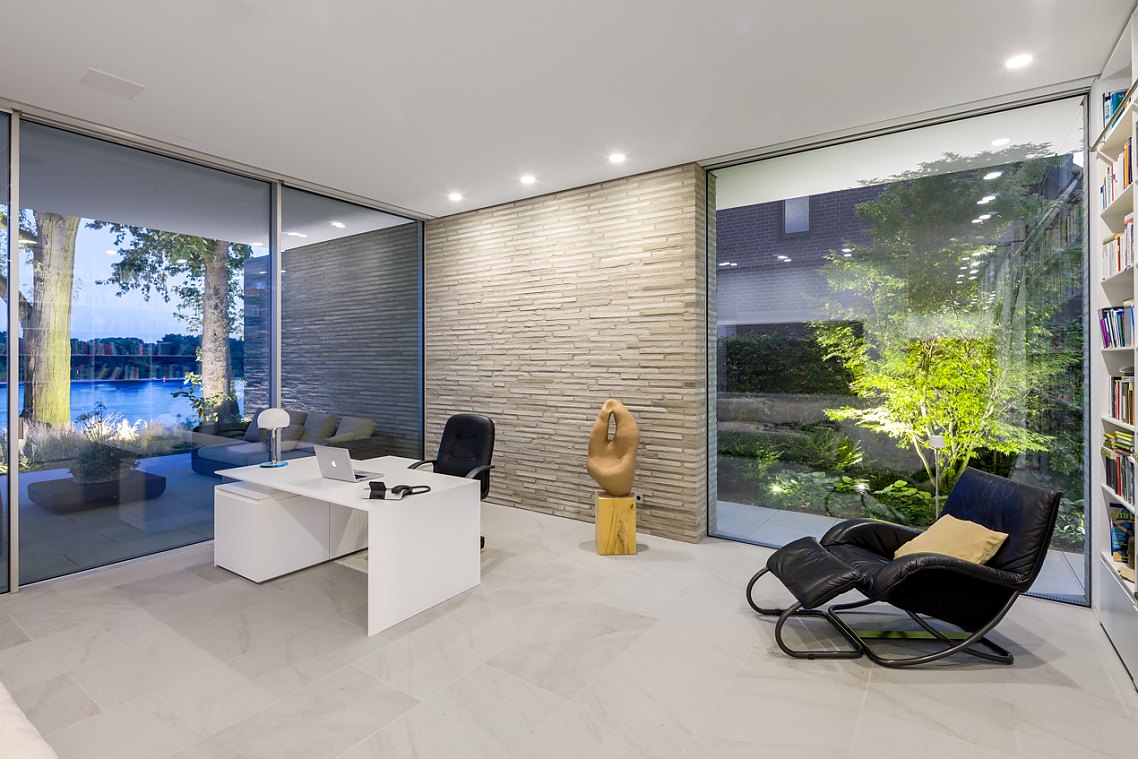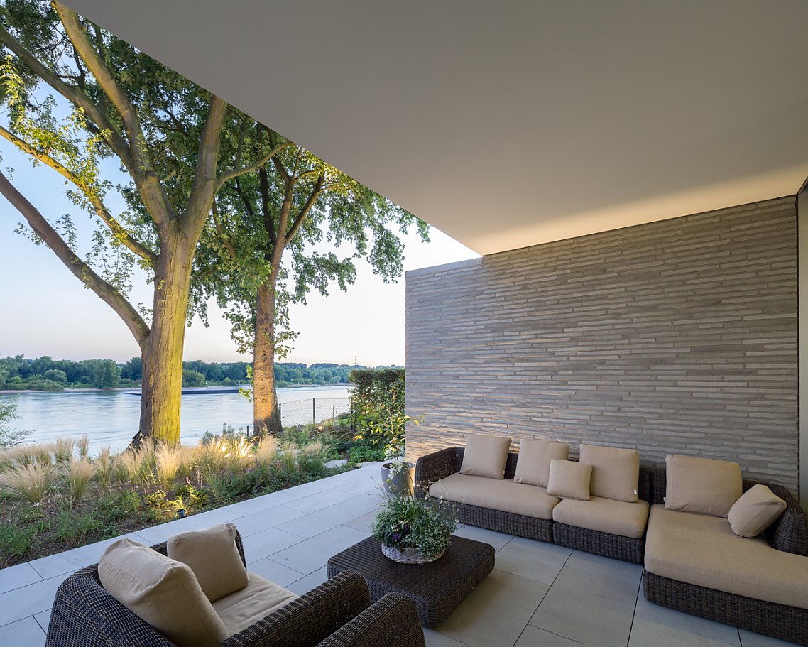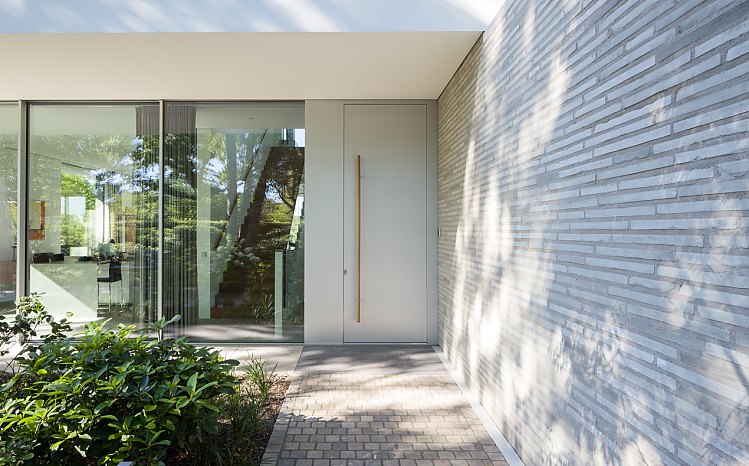 Neben den Minimalfensteranlagen und den weißen Deckenbändern gibt es ein drittes Gestaltungselement: geschosshohe Wandscheiben aus langformatigen grauen Ziegelsteinen, die einen lebendigen Kontrast zu den glatten Glas- und Deckenflächen bilden. Wie der Fußboden aus Ruhrsandstein setzen sich im Gartengeschoss die Backsteinwände von innen nach außen fort, so dass Innen- und Außenräume scheinbar ineinander übergehen und der Eindruck der Transparenz noch verstärkt wird.