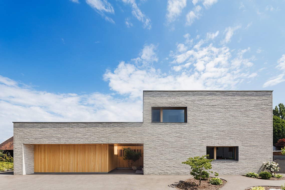 Die Ziegelfassade in Kombination mit den Holzelementen lockert den an sich strengen Charakter der minimalistischen Grundform deutlich auf. Backstein erweist sich hier wieder einmal als ein wunderbares Material, das einer klaren Formsprache angenehme Lebendigkeit verleiht und gleichzeitig die ruhige, elegante Ausstrahlung unterstreicht.