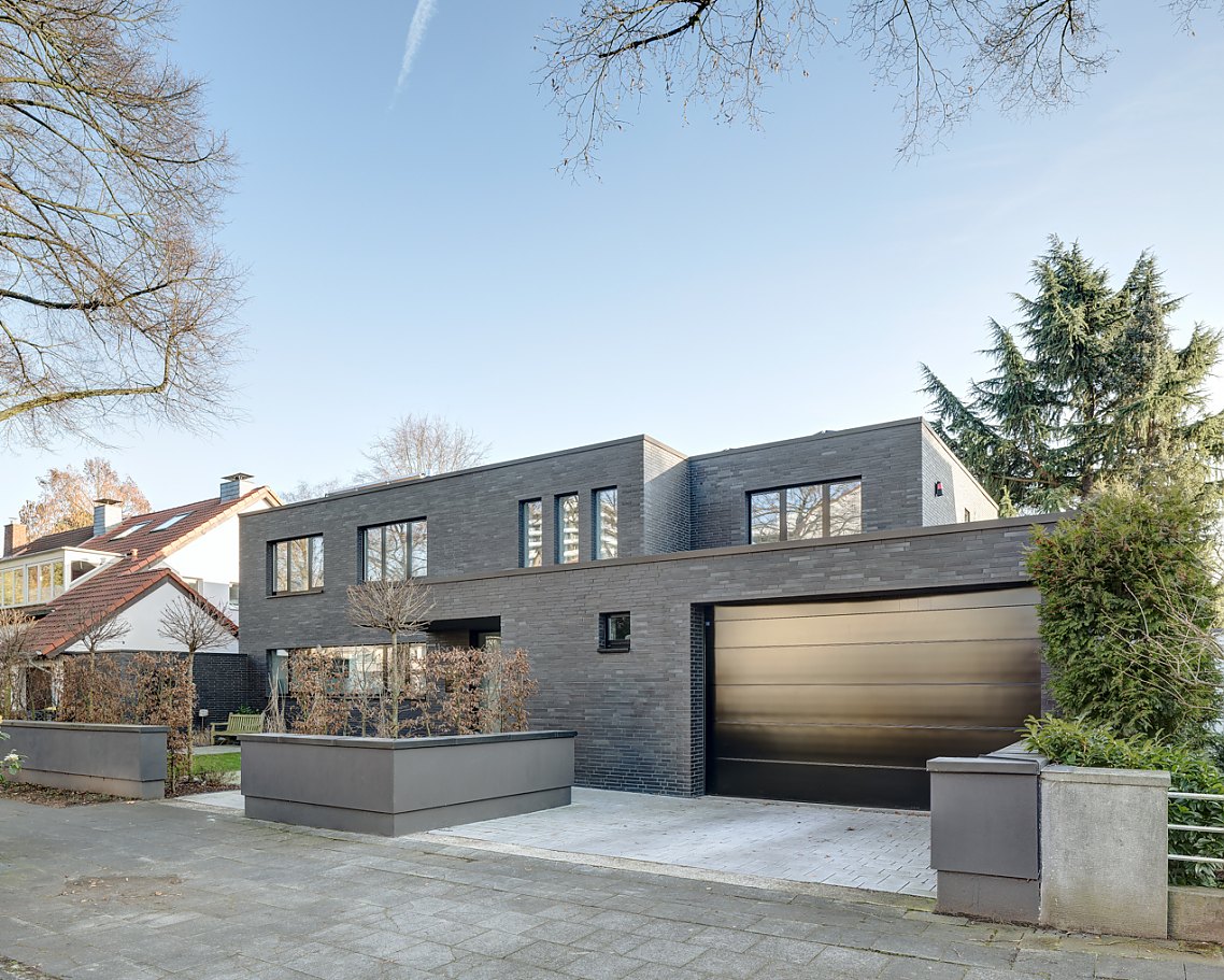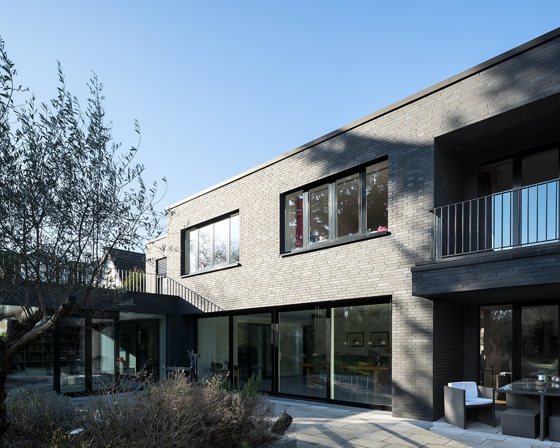 Außen betont schwarzer Klinker die kantige Kubatur. Die Architekten entschieden sich für Backstein, um damit dem eher zerklüfteten Gebäude eine monolithische Anmutung zu geben. Der inhomogene schwarze Klinker erzeugt einen starken Kontrast zur hellen Innenwirkung und bringt das natürlich Steinerne des Werkstoffs zum Ausdruck.
