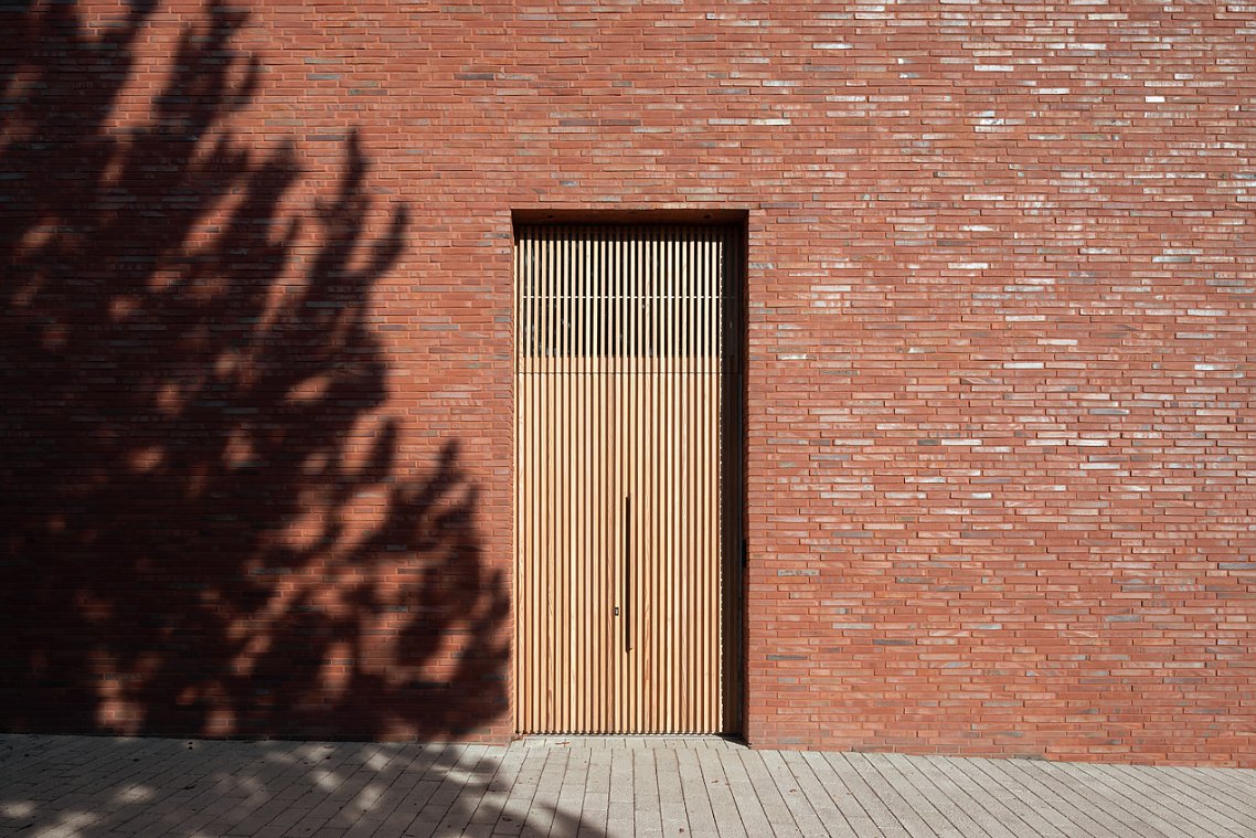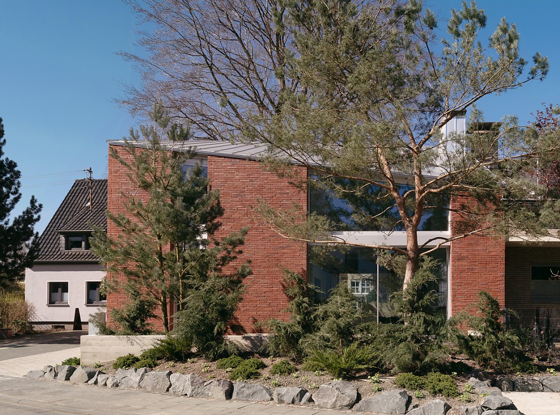 Das Haus ist in eine schlichte, elegante Klinkerfassade gehüllt, die sich zum Garten und Vorgarten teilweise öffnet, während die Südseite bis auf den Eingang geschlossen ist. Die Fassadenklinker wurden in der Region in einem der letzten Ringöfen Deutschlands produziert.