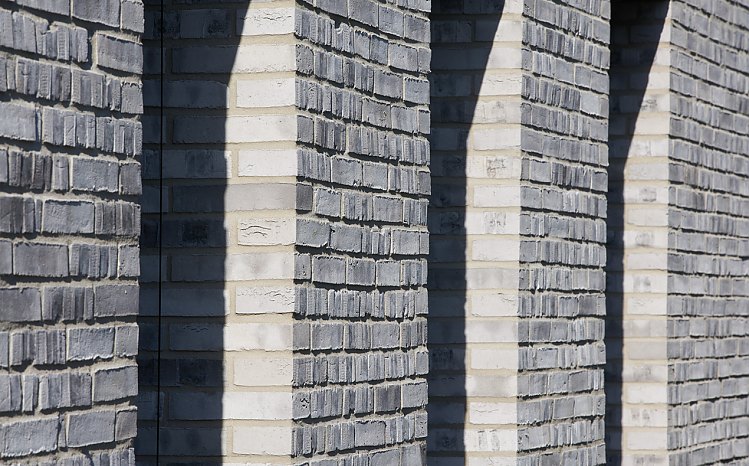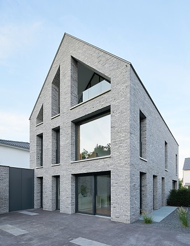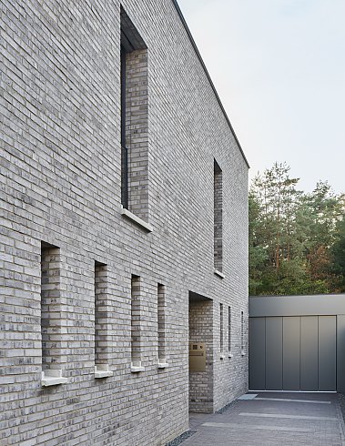 Der Entwurf ist so gestaltet, dass die zukünftigen Nutzer sich nicht gegenseitig stören und eigene Gartenbereiche nutzen können. Für die Außenhaut des Gebäudes wurde ein rauer Backstein in Grautönen gewählt. Die Wasserstrich-Ziegel im Dünnformat sind als Fußvermauerung ausgeführt. Dabei wird die Rückseite (Fußseite) der Klinker als Sichtseite vermauert. So entsteht eine ausdrucksstarke Oberflächenstruktur, die dem klaren, reduzierten Gebäude eine „erdige“, fast schon archaische Anmutung verleiht.