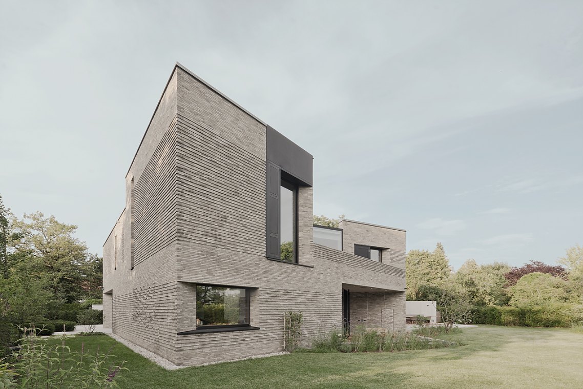 Mehr lesenDie Ziegelfassade aus handgefertigten dänischen Steinen im Flensburger Format ist mit Bändern von schichtweise nach innen und außen springendem Mauerwerk überzogen. Der graugrüne Stein unterstützt das burghafte Erscheinungsbild des Wohnhauses, das sich mit seinen geschlossenen Flächen von der Straße abwendet. Die großen Fenster mit ihren schwarzen Umrahmungen betonen dagegen die drei Ecken des Gebäudes und die Hinwendung zum Garten. Die diagonal über das Grundstück verlaufende Hauptfassade ist exakt nach Süden ausgerichtet und öffnet sich im Erdgeschoss mit großen verglasten Flächen in Richtung Garten und Pool.