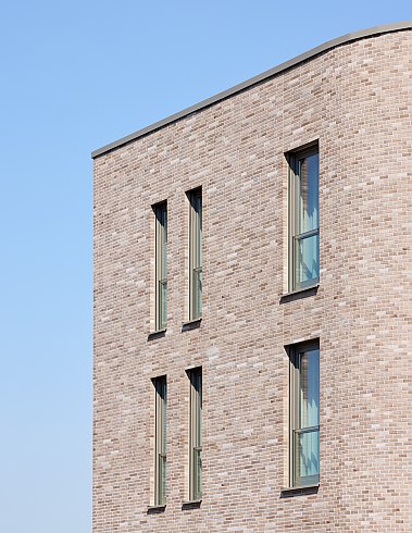 Eine Besonderheit dieses Riemchens ist die je nach Licht- und Witterungsverhältnissen wechselnde Farbwahrnehmung, die dem Objekt eine dynamische Wirkung verleiht. Und auch der Backstein selbst wirkt integrativ: Während von der Hauptstraße aus der Eindruck zweier unabhängiger Gebäude entsteht, verschmelzen beide Baukörper im Innenhof aufgrund der durchgehenden Backsteinfassade.
