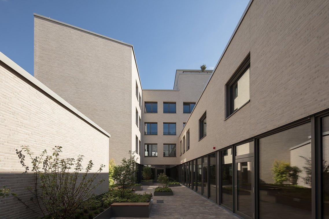 Der gesamte Baukörper steht im Dialog mit der Antoniterkirche. So auch die helle Ziegelfassade, die sich am warmen Naturstein der Kirche orientiert. Der Backstein unterstreicht ideal die ruhige, wertige Atmosphäre dieses innerstädtischen Rückzugsortes.