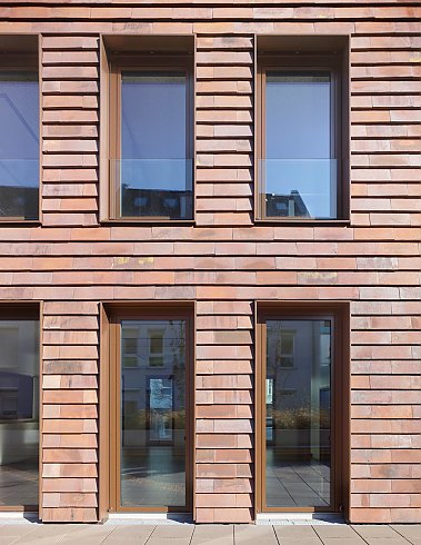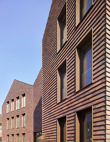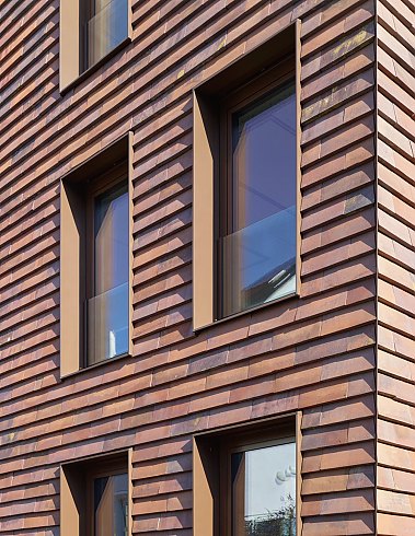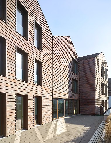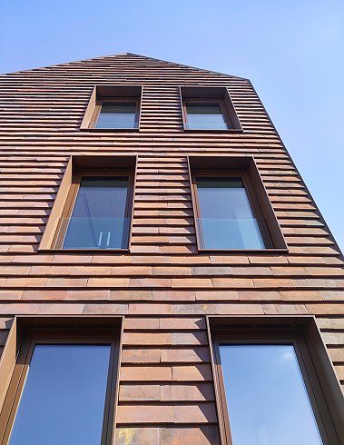 Seine besondere Ausstrahlung erhält DAS AURA durch die komplette Verkleidung mit Petersen Cover Ziegeln. Petersen Cover ist ein innovatives Ziegelprodukt der dänischen Ziegelei Petersen Tegl, das als Dach- und Fassadenziegel einsetzbar ist. Mit den handgefertigten Ziegeln kann man Gebäude „von Kopf bis Fuß“ einkleiden und so eine sehr außergewöhnliche Wirkung erzielen, die mit vielen Umfeldern hervorragend harmoniert.
