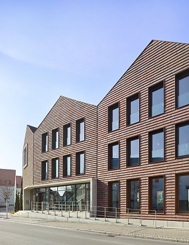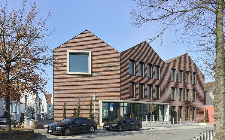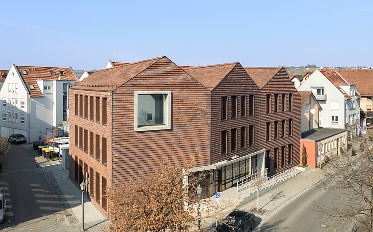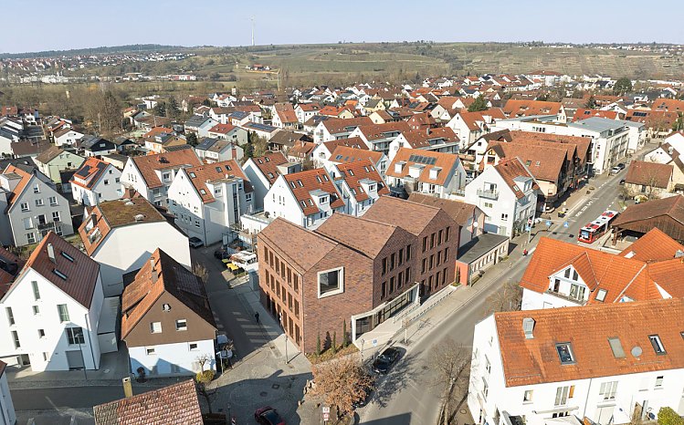 Dies zeigt sich auch in Pleidelsheim: Mit den drei Giebeln und der Petersen Cover Verkleidung hebt sich DAS AURA deutlich ab und passt dennoch ganz selbstverständlich in seine Umgebung.