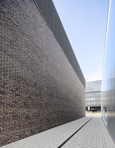 Die Ziegelfassade aus grob strukturierten schwarzbraunen Backsteinen verleiht der Halle einen rauen, lebendigen Charakter, der hervorragend mit den noch vorhandenen Teilen der historischen Industriearchitektur korrespondiert.