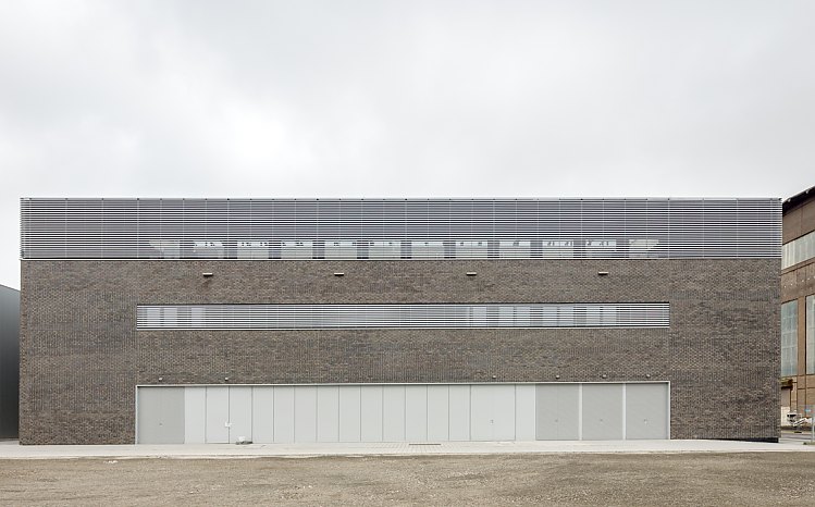 Mehr lesenDie Halle für bauingenieurtechnische Versuche ist Bestandteil des Innovationszentrums. Hier werden bauphysikalische Versuche durchgeführt und Bauteile auf Materialfestigkeit geprüft. Die architektonische Form folgt klar der technischen Funktionalität. Das kompakte Volumen verfügt über drei große Liefereingänge, die von LKW bis zu 13 Tonnen befahren werden können.