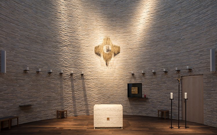 Der gesamte Neubau von St. Johannes ist außen mit einer Klinkerfassade verkleidet. Der Stein – ein hellgelber Wasserstrich-Klinker mit reduziertem Brand in einer Sortierung mit etwas höherem Grauanteil – setzt sich auch im Inneren der Kirche fort. So entsteht der Eindruck einer homogenen Steinwand, der uns aus historischen Kirchen vertraut ist. Aber was als 53 cm dicke Wand erscheint, ist ein mehrschichtiger Aufbau aus zwei Klinkerschalen, Dämmung, tragender Leichtbetonwand und Luftschicht. Die Homogenität des Steinmaterials wird lediglich erzählt und damit der Bogen zu einer jahrhundertealten Kirchenbautradition gespannt.