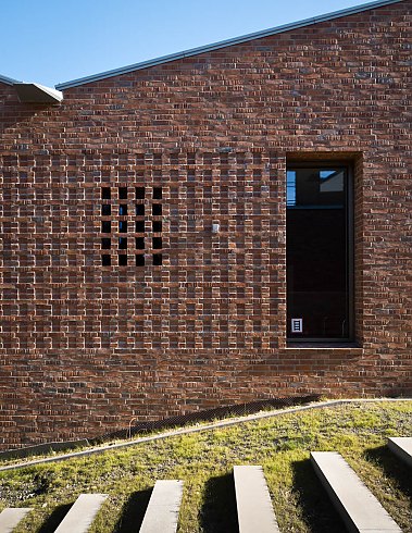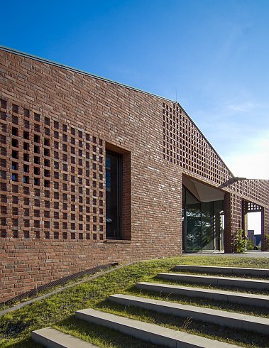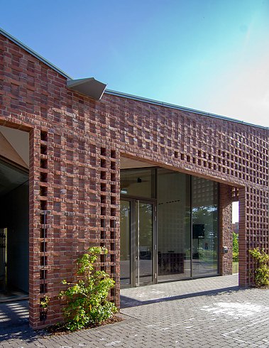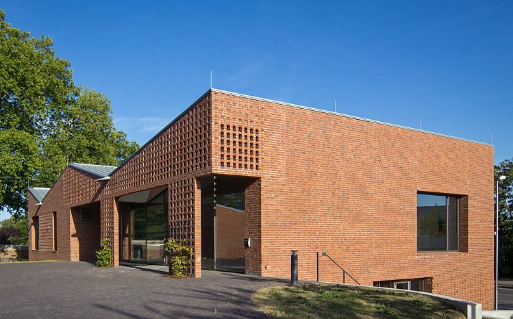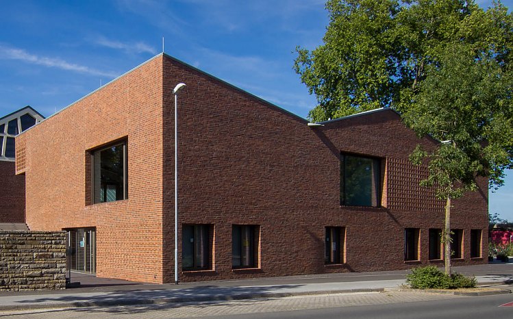 Die Architekten haben sich für einen rötlichen Wasserstrichziegel entschieden, der mit seiner lebhaften Form hervorragend mit der alten Ziegelfassade der Kirche korrespondiert. Um die Lebendigkeit der Fassade noch zu steigern, wurde die unregelmäßige Lagerseite des Ziegels im Wechsel mit der Sichtseite vermauert. Die eingesetzten Vollziegel eigneten sich besonders gut für die Umsetzung der großen Wandflächen im Wechsel mit Lochmustern und profilierten Oberflächenstrukturen.