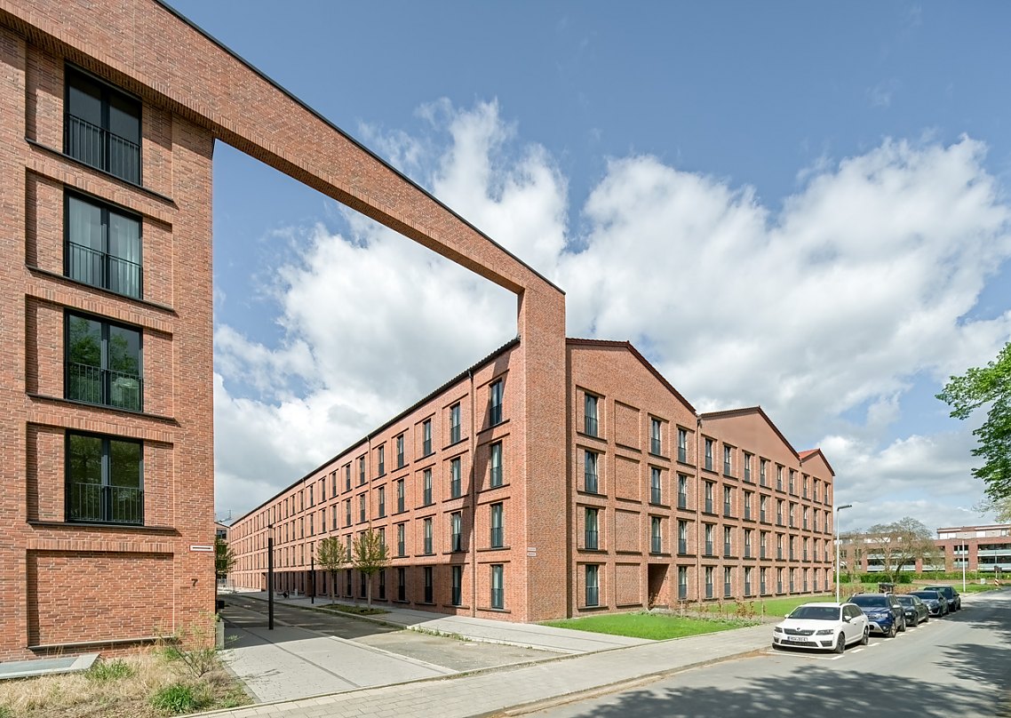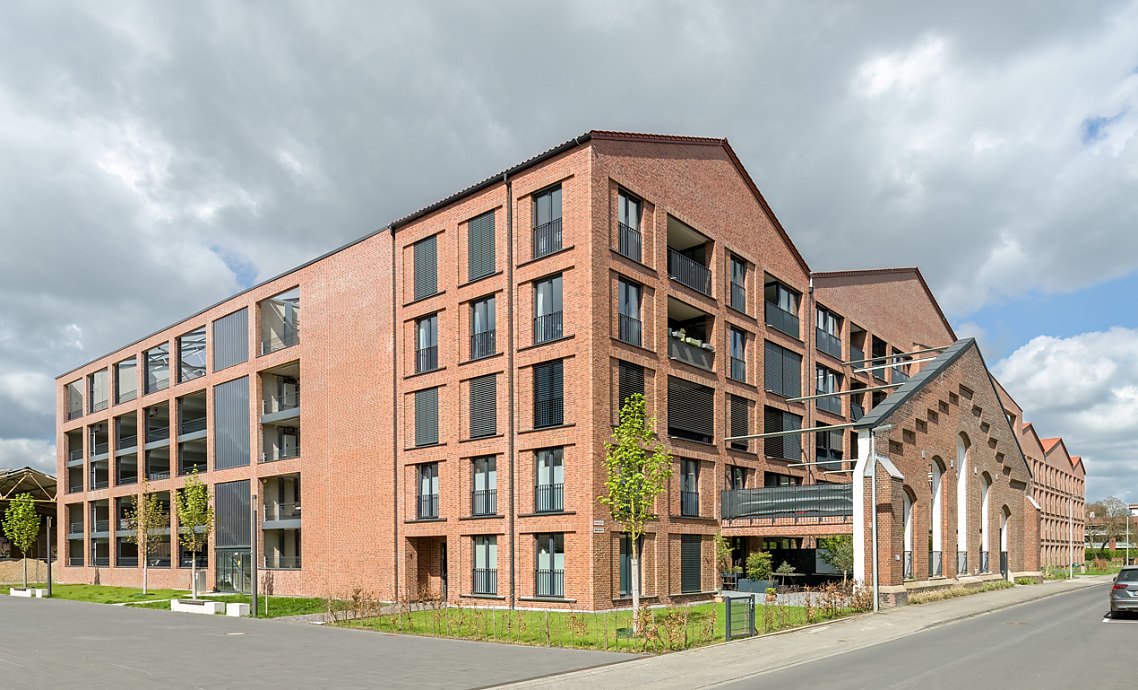 Seine Westfassaden werden als Bestandsgiebelwände erhalten. Die Gestaltungsprinzipien und Ziegelfassaden der Neubauten orientieren sich am Bestand. So bleibt die industrielle Vergangenheit lebendig und verleiht dem Quartier eine besondere Identität.