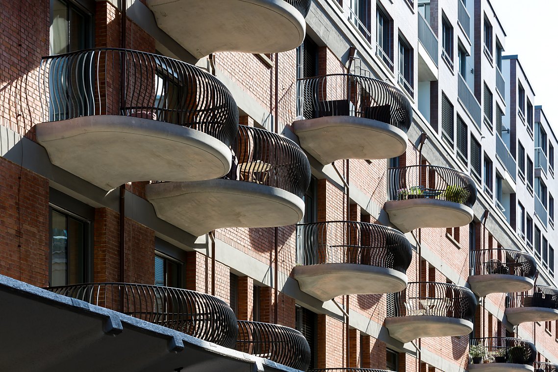 Mehr lesenErst eine sorgfältige Untersuchung des Tragwerks und eine Nutzlastumverteilung eröffneten die Möglichkeit, die Bausubstanz im ältesten Gebäudeteil zu erhalten, aufzustocken und für den Wohnungsbau umzunutzen. Im Bestandsgebäude wurde die hallenartige Stützenstruktur erhalten. Auch äußerlich erinnert die strenge, horizontal gegliederte hellrote Backsteinfassade an das erste Leben des Gebäudes als sachlicher Industriebau.