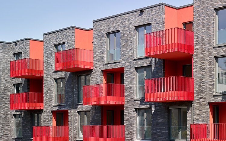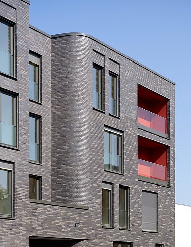 Mehr lesenDie moderne stadt wünschte sich für Clouth 3 „etwas Außergewöhnliches, ein kleines Architektur-Spektakel“. Diesem Anspruch wird der Neubau vollauf gerecht. Die skulpturalen Baukörper aus anthrazitfarbenem, fast schwarzem Klinker in Kombination mit leuchtend roten Balkonen stechen aus den sonst eher hell gestalteten Fassaden der umliegenden Bebauung heraus.