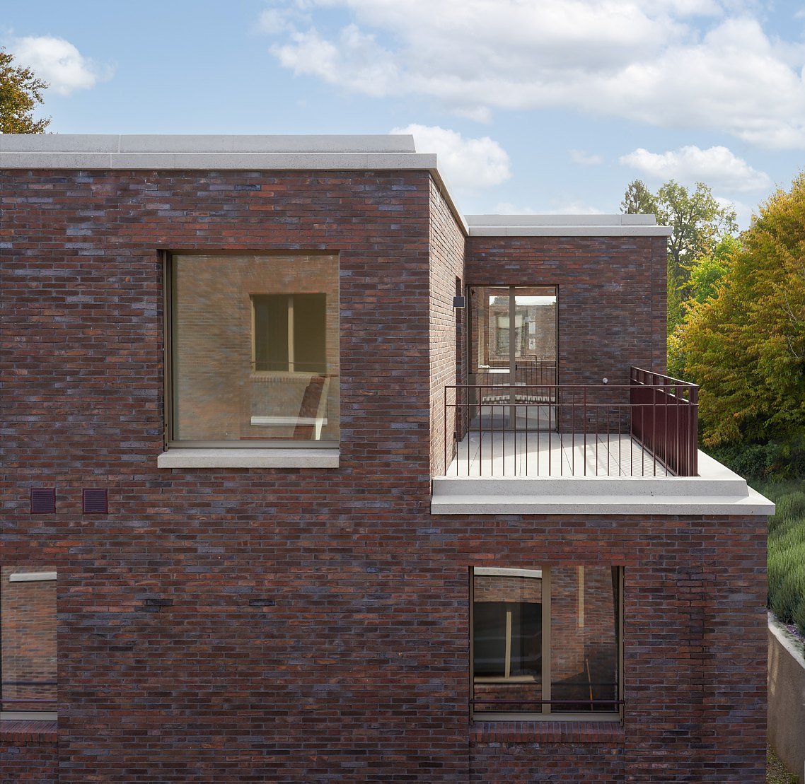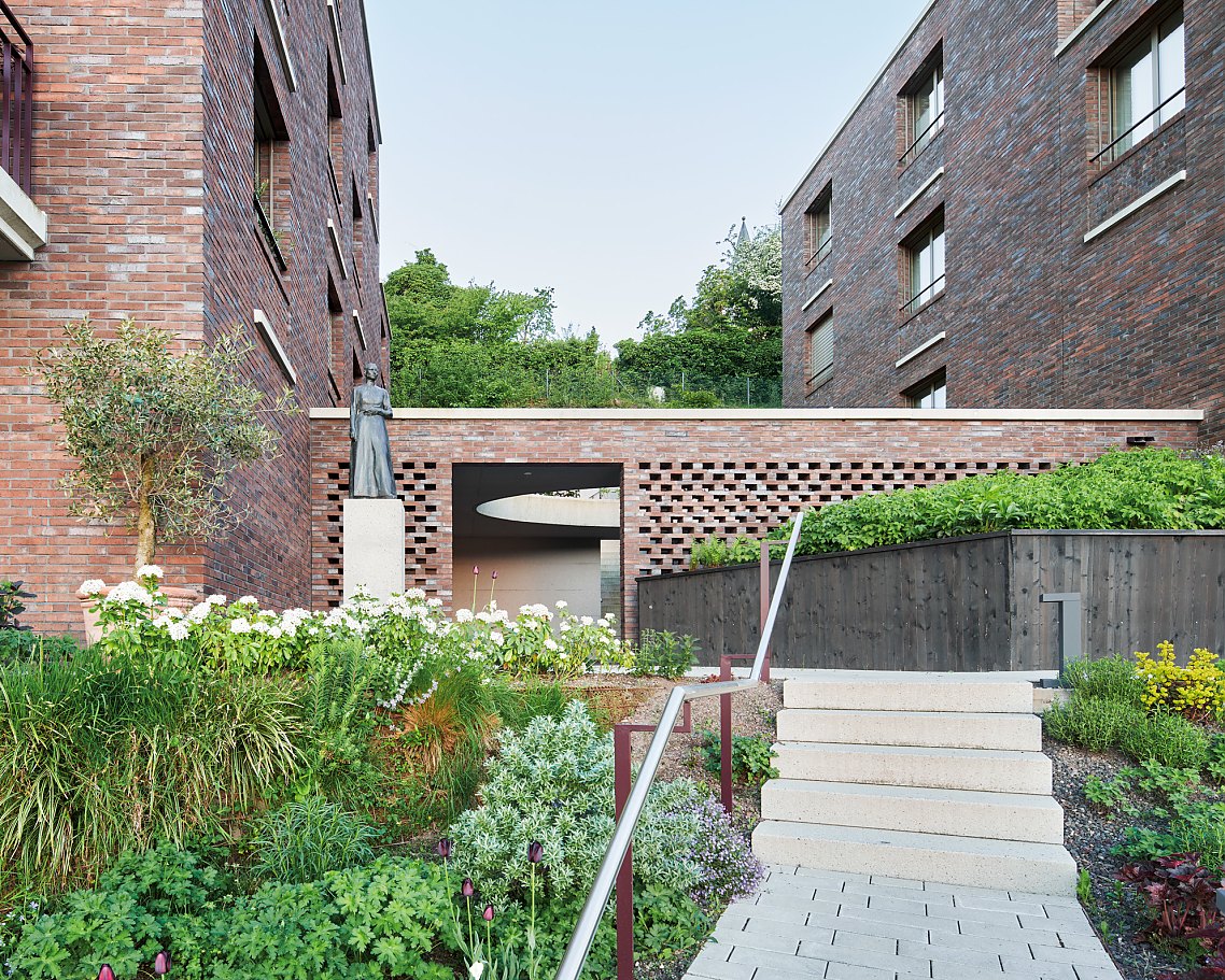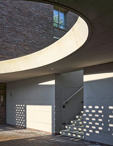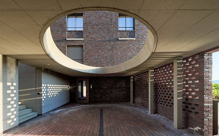 Beide Häuser sind mit Klinkern in lebendig changierenden Rot- und Violett-Tönen verkleidet. Das Thema Klinker findet sich auch am Boden und in den Lochmuster-Wänden der eindrucksvoll gestalteten Eingangshalle wieder, die beide Gebäude verbindet. Sie ist unterirdisch angelegt und wird durch ein großflächiges elliptisches Oberlicht erhellt, das wiederum Durchblicke auf die Klinkerfassaden ermöglicht. So wird Backstein zu einem prägenden Gestaltungselement der hochwertigen Wohnarchitektur.