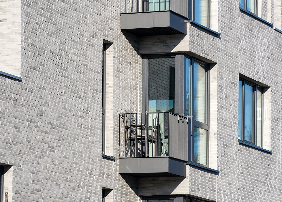 Die grau changierende Klinkerverblendung im Dünnformat unterstreicht die Prägnanz des Quaders und verleiht der Fassade Lebendigkeit. Durch die Wahl des Klinkers wird eine deutlich wertigere Anmutung hier übrigens auf sehr wirtschaftliche Weise erreicht.