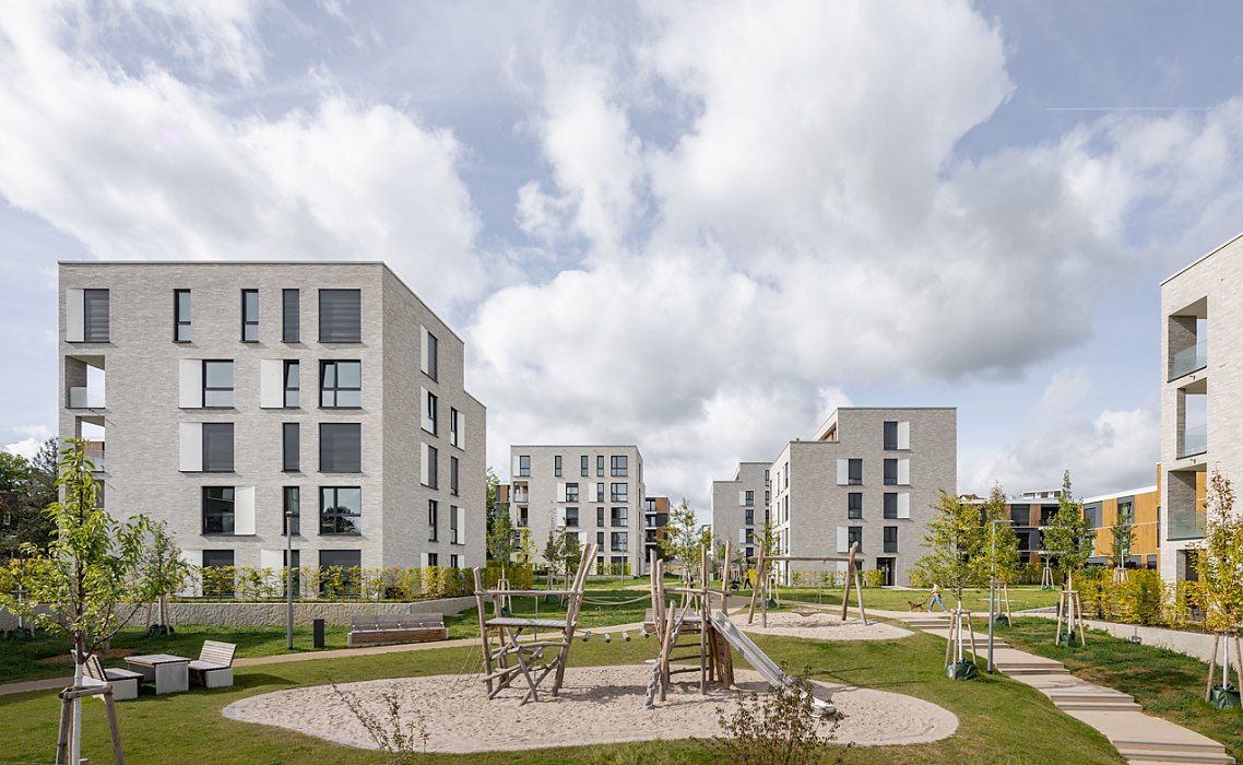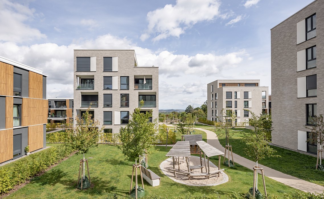 Mehr lesenDer Entwurf nutzt das attraktive Gelände mit seiner Topographie und der angrenzenden freien Landschaft optimal aus. Die Gebäude sind U-förmig um eine grüne Mitte angeordnet, die sich zum Tal hin öffnet und aufweitet. So wird die Landschaft bis ins Quartier erlebbar und es ergeben sich wunderbare Ausblicke in die Ferne. Der Wechsel zwischen L- und Punkt-förmigen Gebäuden definiert klare Kanten entlang der Straßen und öffnet gleichzeitig Übergänge zum grünen Freiraum.