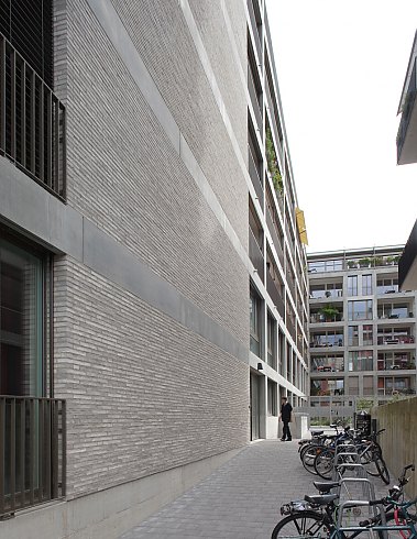 Mehr lesenNach fast 150 Jahren nimmt diese Vision mit den Ausdrucksmitteln moderner Architektur Gestalt an: Zwei neue sechs- bis sieben-geschossige Neubaukörper bilden mit zwei bereits existenten Wohngebäuden einen großen städtischen Innenhof, der durch einen weiteren fünfgeschossigen Baukörper unterteilt wird. Dadurch entsteht ein ruhiger, begrünter und lichtdurchfluteter Wohnhof, nach dem sich die meisten Wohn- und Arbeitsräume sowie Loggien orientieren.