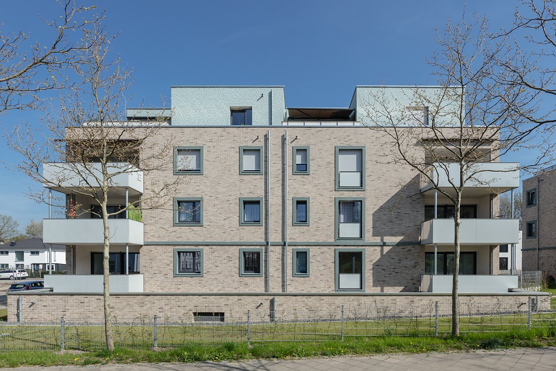 So fiel die Wahl auf einen Ziegel, der allen Erfordernissen entsprach und den Bauherrn auch hinsichtlich der Preisgestaltung überzeugte. Die Farbigkeit des Gebäudes antwortet selbstbewusst auf das gegenüberliegende, umgenutzte Kasernengebäude aus den 30er Jahren mit seinem Sockel und seinen Gewändern in Anröchter Stein. Sowohl die Fenstergewänder als auch die mit geätztem Mosaik verkleideten Staffelgeschosse greifen die Farbe des Steins auf. Die Farbe des Ziegels wurde passend dazu gewählt.