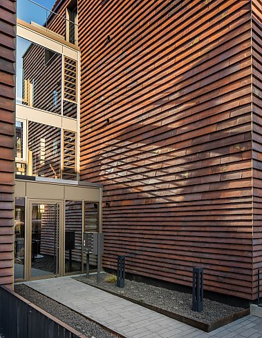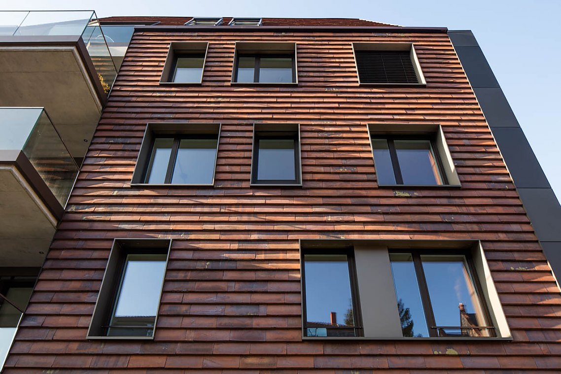 Die verwendeten Ziegel stammen aus der neuen Produktlinie „Cover“ der dänischen Ziegelei Petersen und wurden so in Deutschland erstmals verbaut. Sie sind in Handarbeit aus englischen und deutschen Tonerden hergestellt, in Holzformen geprägt und gebrannt. Durch den handwerklich ausgeführten Brand des Tons entstehen unterschiedliche Nuancen in Farbe und Textur, die der Fassade ihre Lebendigkeit verleihen. Die Ziegel werden als hinterlüftetes Fassaden- und Dachsystem ausgeführt.