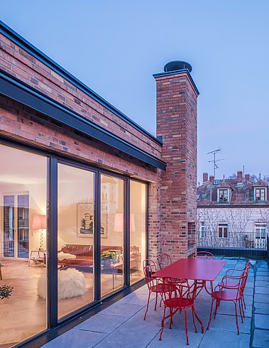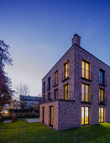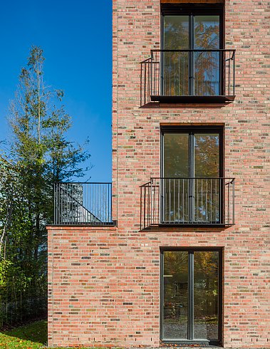 Grundrisse und Konstruktion sind so angelegt, dass mit geringen Veränderungen auf jeder Ebene sowohl gearbeitet als auch gewohnt werden kann. Heute befindet sich im Erdgeschoss eine Büroeinheit, darüber vier Wohnungen. Die Architektur bedient sich nur weniger Elemente: Austritte, Balkone und Terrassen in schwarz gestrichenem Baustahl, gleichmäßig verteilte reine Holzfenster, feine Profilierungen an den horizontalen Abschlüssen, ein bildhafter Kamin am Dach und eine warm-rote Verkleidung aus unregelmäßigen Klinkern.