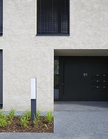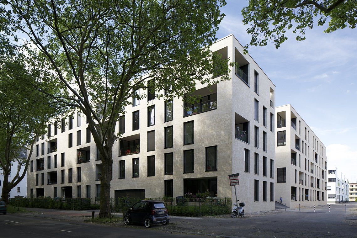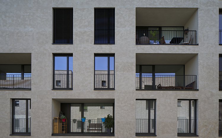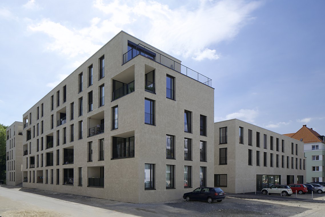 Dies spiegelt sich in der Architektur wider: Lebendig und zugleich zusammengehörig wirken die komplex geschichteten Neubauten mit ihren frei gegliederten horizontalen Öffnungen für Laubengänge, Loggien und Fenster. Die Außenfassade aus Ziegelriemchen in Sondersortierung unterstreicht die lebendige, wohnliche und hochwertige Anmutung des zukunftsweisenden Quartiers.