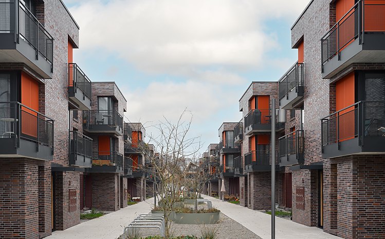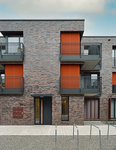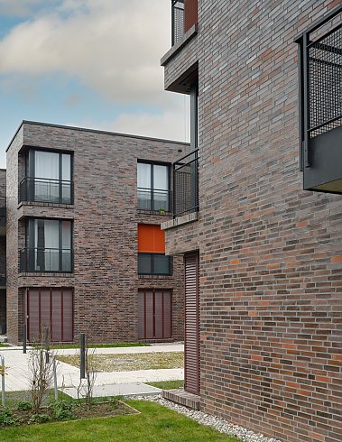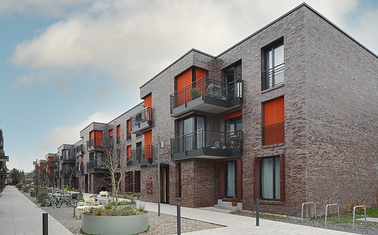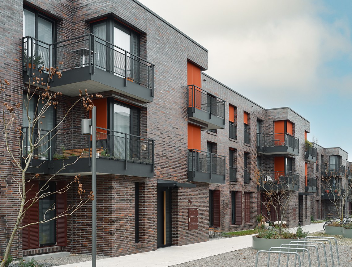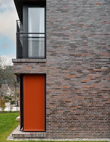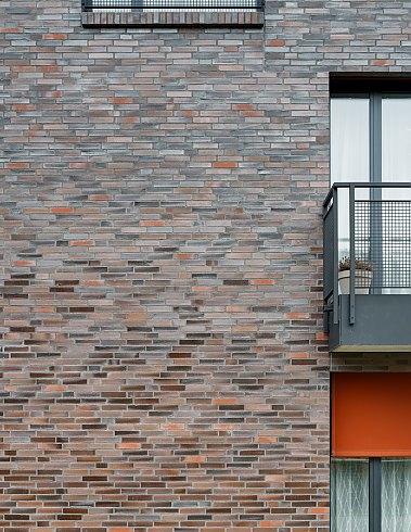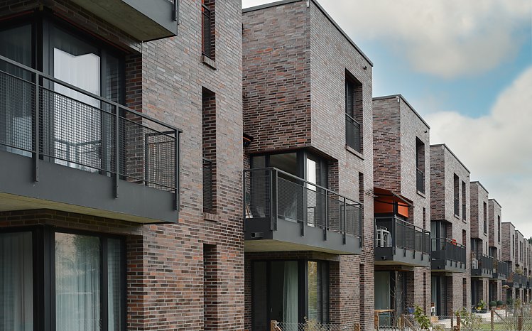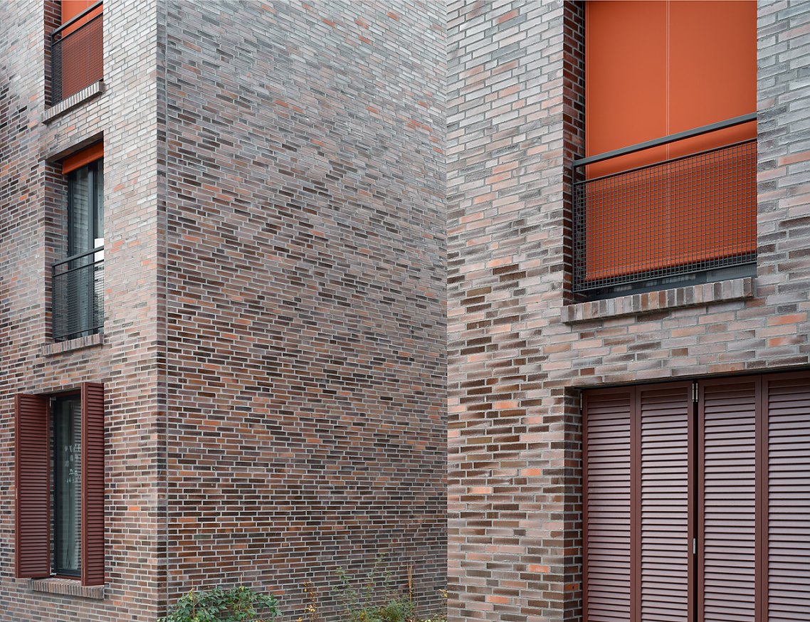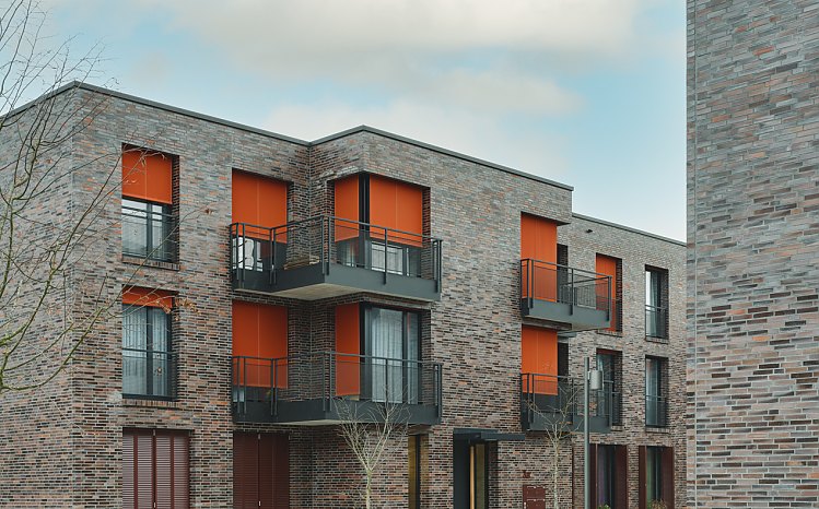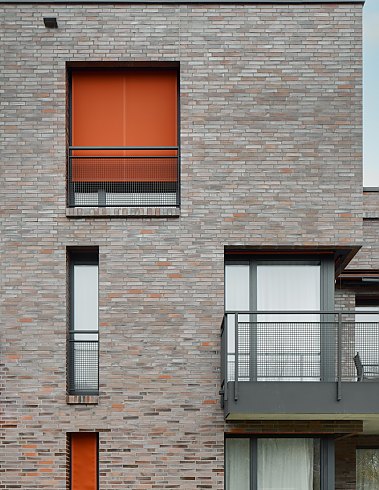 Die Steine mit ihren diversen Farben und Schattierungen sind je nach Licht und Wetter sehr vielseitig im Ausdruck. Sie kontrastieren mit den farbigen Stoffmarkisen und verleihen den Bauten Natürlichkeit und Lebendigkeit. Backstein trägt hier als Teil eines stimmigen Gesamtkonzepts zu einer zukunftsweisenden Version von „Suburbia“ bei.