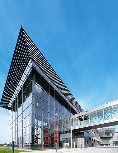 Mehr lesenArchitektonisch fällt vor allem der gelungene Kontrast zwischen lichtem Glas und großflächigen, anthrazitfarbenen Klinkerfassaden auf. Bei den Verblendmauersteinen wechseln sich Bereiche mit glänzender und matter Oberfläche ab. Dadurch entsteht eine ruhige, horizontal gebänderte Fassadenordnung, deren Stringenz bei unterschiedlichem Tageslichteinfall und Betrachtungswinkel von einem spannungsvollen optischen Effekt aufgelockert wird.