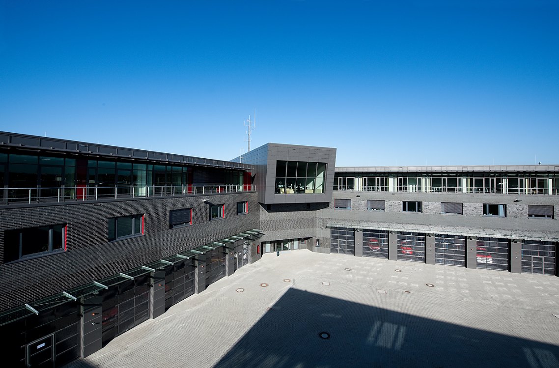 Bei der Planung der Hauptfeuer- und Rettungswache Mülheim an der Ruhr stand die Funktionalität im Fokus. Eine Feuerwehr muss vor allem schnell sein. Kurze Wege waren deshalb eine zentrale Anforderung an das Gebäudekonzept. Gebäudeteile mit den unterschiedlichsten Funktionen gruppieren sich um einen großflächigen Innenhof und bilden einen geschlossenen Gesamtkomplex.
