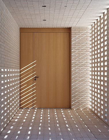 Dem gesamten Gebäude liegt ein Materialkonzept zugrunde, das auf helle, zurückhaltende, authentische Werkstoffe mit einer warmen Anmutung setzt. In den Wandelgängen des öffentlichen Bereichs schaffen Eiche und Terrazzo eine ruhige Atmosphäre, die durch das vom Filtermauerwerk gedämpfte Licht unterstrichen wird.