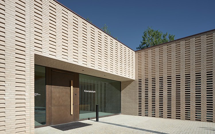 Außen setzt eine helle Klinkerfassade das Materialkonzept fort. Ihr teilweise als Filtermauerwerk ausgeführtes Backsteinmuster strukturiert die teilweise sehr langen Außenwände des Neubaus und ist gleichzeitig eine Reminiszenz an die Farbigkeit und die sehr schönen handwerklichen Details der denkmalgeschützten Trauerhalle. Farbigkeit und Oberfläche des Backsteins wurden sehr intensiv bemustert, bis die Entscheidung auf einen beigen, zusätzlich geschlämmten Klinker fiel, der fast monochrom wirkt, aber immer noch Textur aufweist.