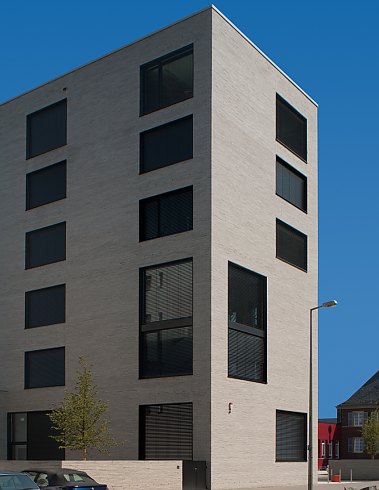Der Dialog mit dem Umfeld zeigt sich auch in der Materialwahl. Hier war Sichtmauerwerk als verbindendes Element natürlich erste Wahl. Die Fassade des Neubaus besteht aus langformatigem Klinker-Verblendmauerwerk mit einer Dämmstärke von 20 cm vor 25 cm starken Stahlbetonwänden. So trägt Backstein nicht nur zur ästhetischen Verbindung mit dem Umfeld, sondern auch zur energetischen Optimierung des Gebäudes bei.