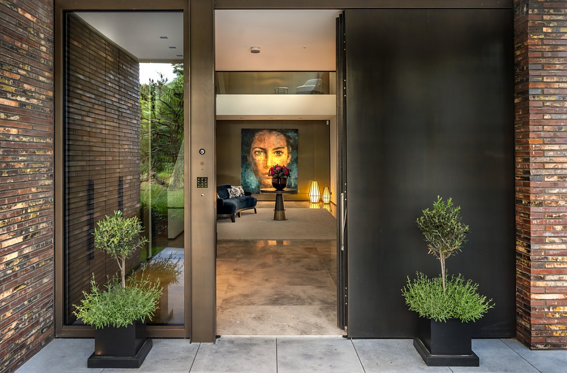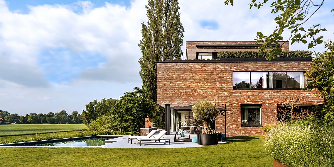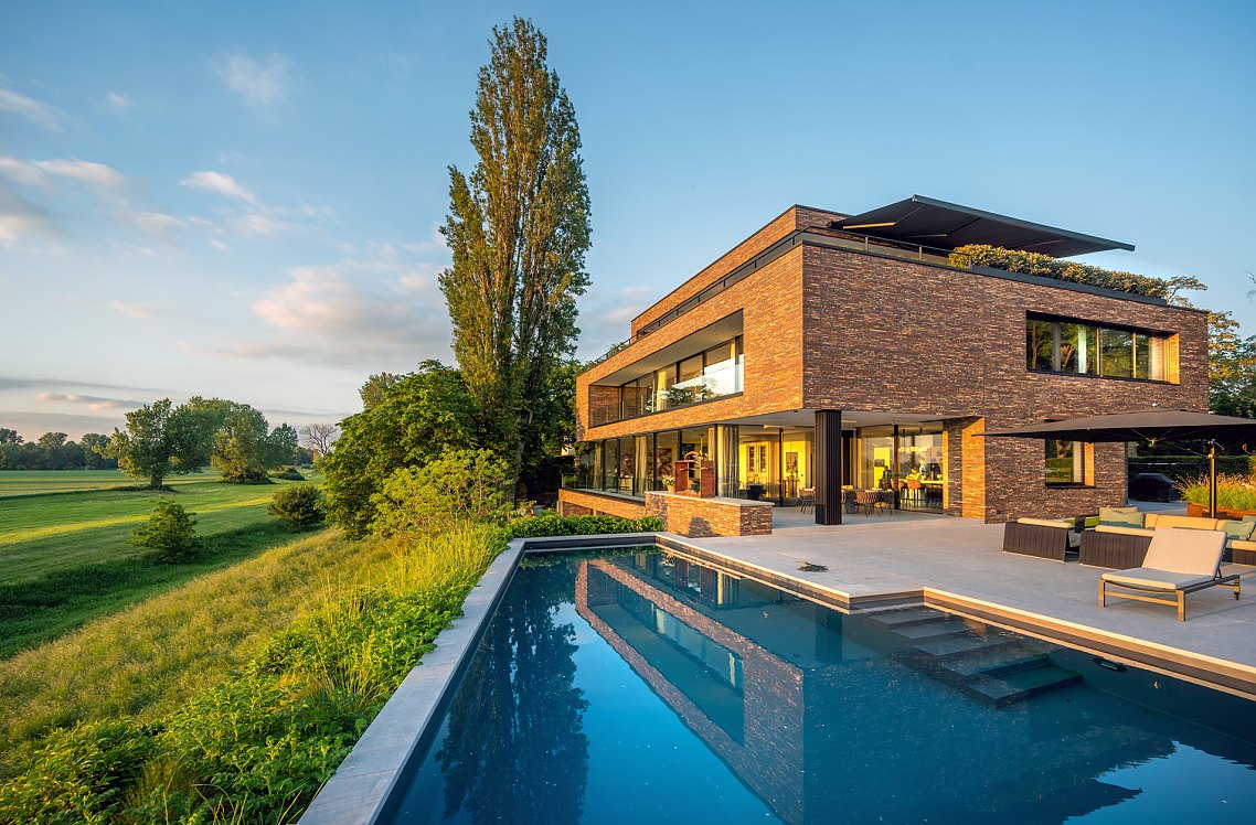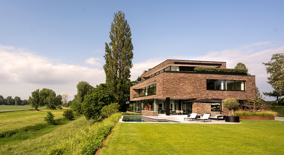 Die direkt an den Rheinauen gelegene Villa bietet einen spektakulären Weitblick auf die Felder und den Rhein, der von der Architektur eindrucksvoll in Szene gesetzt wird. Das zweigeschossige Wohnhaus mit zusätzlichem, zurückspringendem Dachgeschoss öffnet sich zur Rheinseite auf jeder Etage mit raumhohen, nahezu rahmenlosen Glasfronten aus pulverbeschichteten schwarzen Aluminiumprofilen.